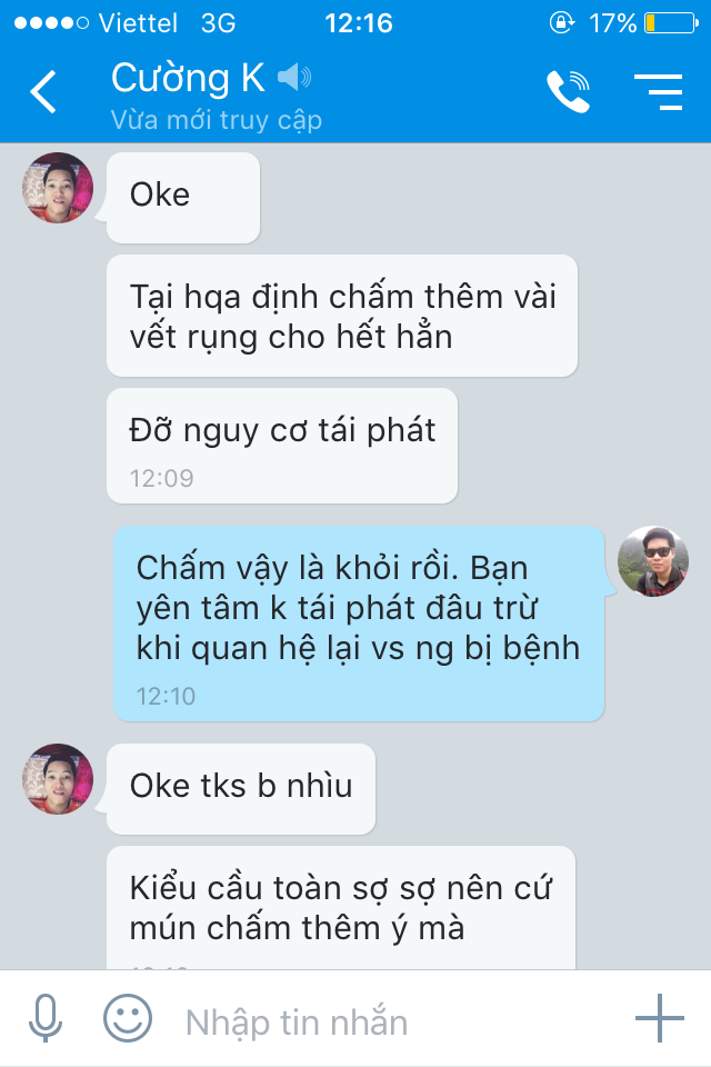 – Thời gian khỏi bệnh khoảng 4 -7 ngày là các bạn trở lại trạng thái bình thường như chưa bị sùi mào gà, số lần chấm thuốc khoảng 2-3 lần so với người mới bị, và 4-6 lần chấm cho người nốt sùi to bằng hạt lạ.